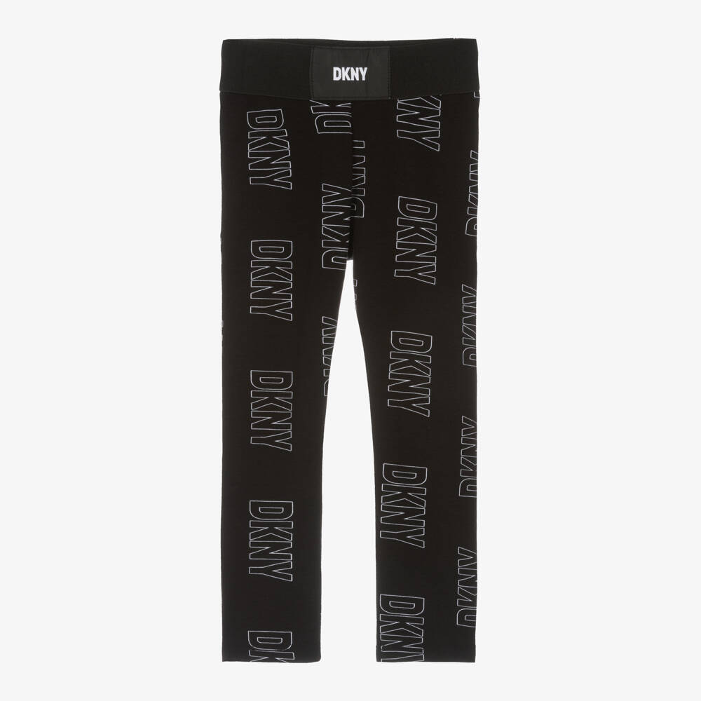 Black leggings for girls by streetwear brand DKNY, made from soft and stretchy cotton jersey. They have a vertical white logo print, with a logo badge on the elasticated waistband for a cool, casual finish.