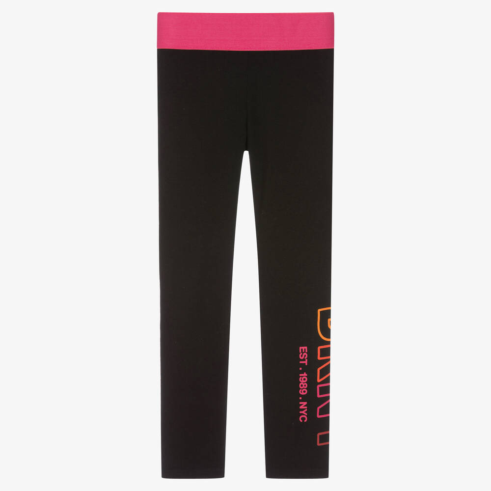 Girls black leggings from DKNY, made in soft organic cotton jersey. They have a bright pink elasticated waistband for a pop of colour and comfort. One leg is printed with pink and orange logo for a designer finish.
