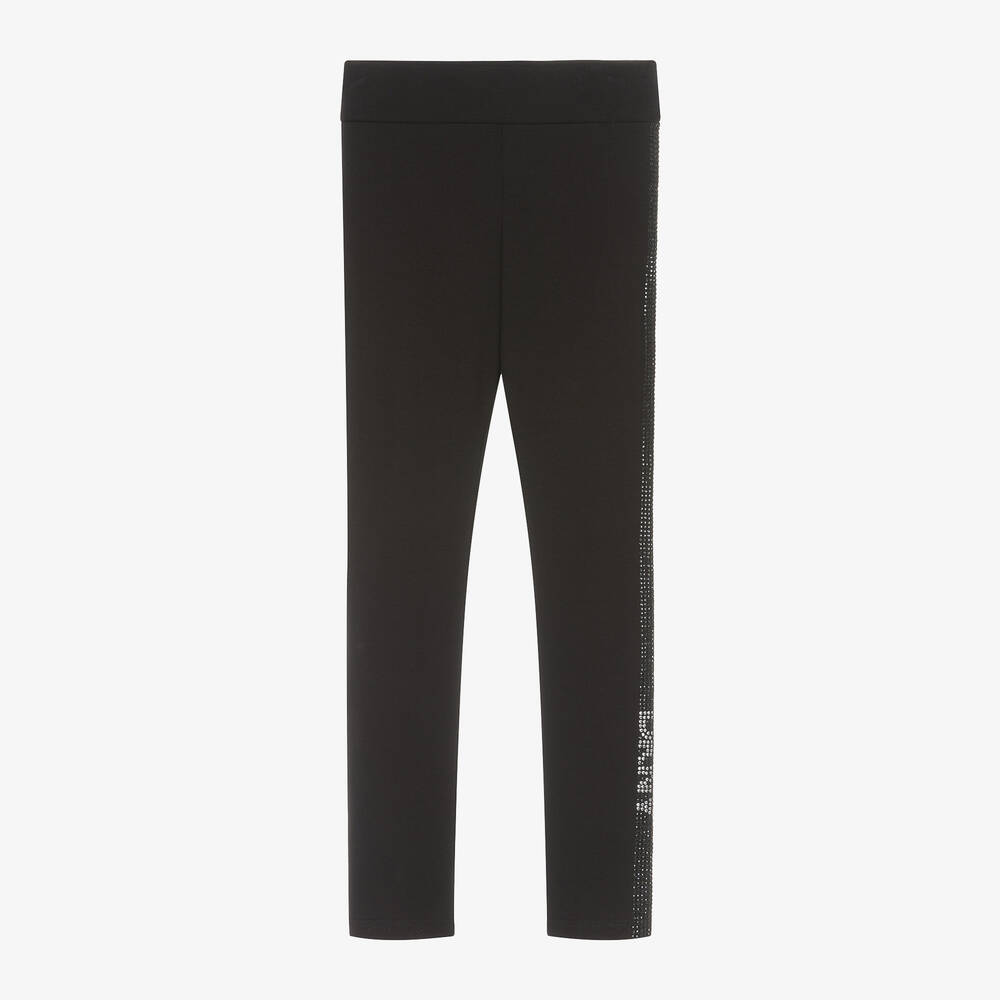 Black full-length leggings for girls by DKNY, made from soft cotton jersey with a comfortable elasticated waist. To add a touch of sparkle to this casual style, they are decorated with black rhinestones on one side with a silver logo detail for an element of branding.