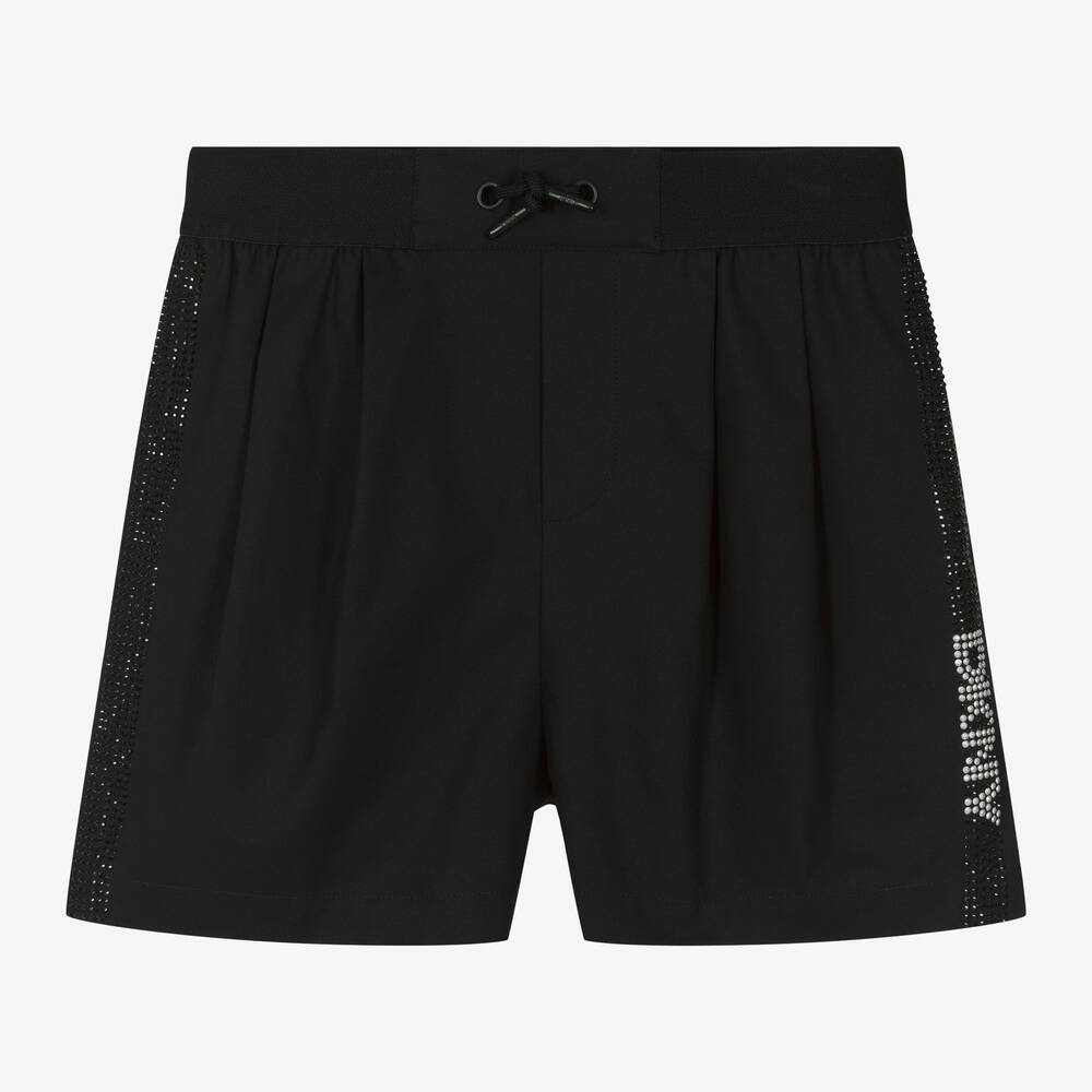 Black shorts for girls by DKNY, made from soft cotton twill. Subtly pleated on the front, they have bands of black rhinestones embellishing each side, featuring a studded silver logo for instant brand identity. The comfortable elasticated waistband is decorated with a faux drawstring design to enhance the sporty look.