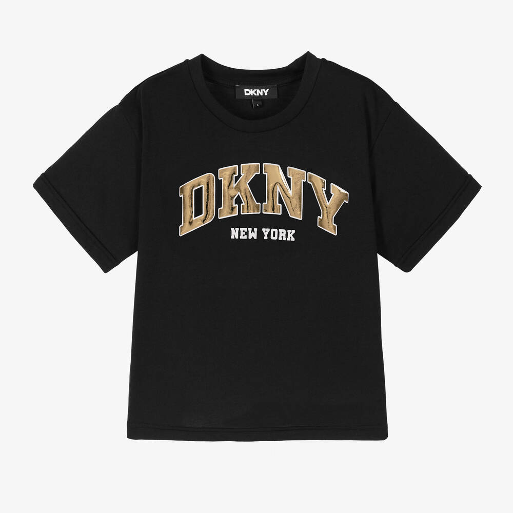 Black T-shirt for girls by DKNY, made in a soft and stretchy cotton blend jersey. Inspired by the adult collection, this casual and comfortable wardrobe staple has a shiny metallic gold logo on the front for an instantly recognisable designer finish.