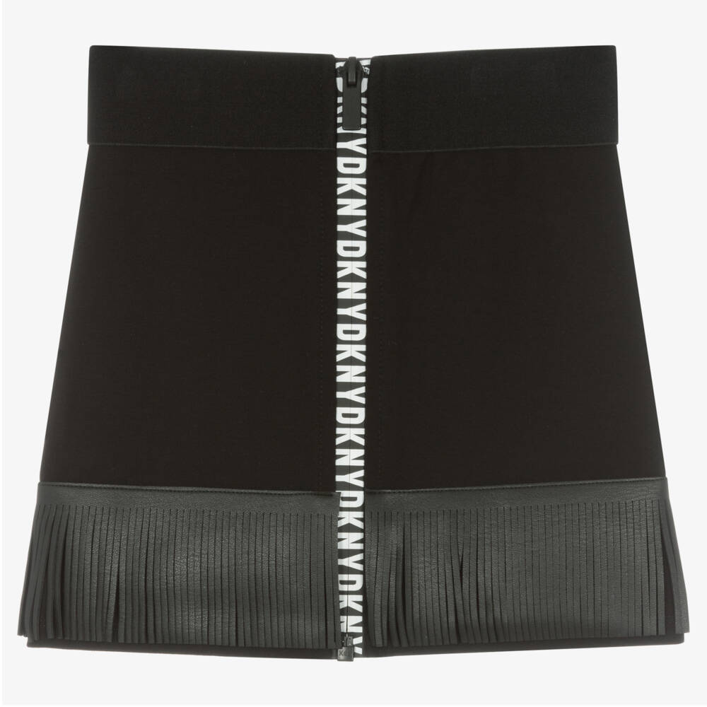 A black skirt for girls by DKNY, made in soft and stretchy viscose jersey. Cool and edgy, it has a logo zip fastening on the front, with a faux leather fringed hem. The elasticated waistband ensures easy and comfortable wear.