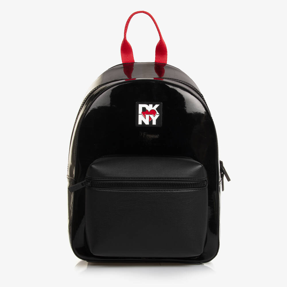 A glossy black backpack for girls by DKNY, part of the brand's Heart of NY capsule collection. Branded on the front, this stylish bag has a lined compartment with two inside pockets. There is a zip pocket on the front in contrast faux leather, providing extra space for essentials. The webbing straps are fully adjustable and woven with white logo lettering for a bold, designer look. A red carry handle is attached to the top for easy handling.