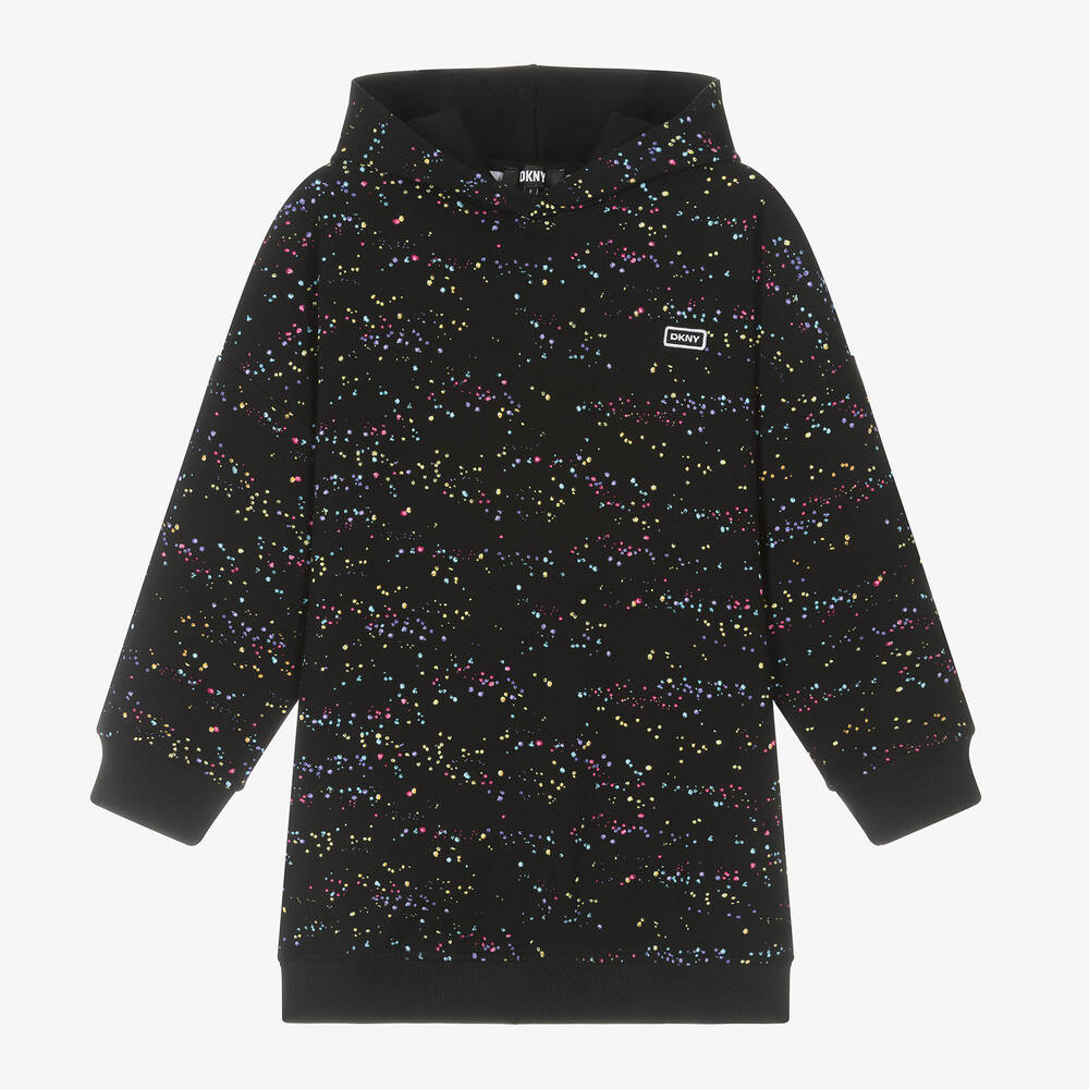 Cool and casual black sweatshirt dress for girls by American streetwear brand DKNY. Designed with a multicolour starlight pattern, this laid-back style is made in stretchy Milano jersey, with an attached hood and ribbed trims. An embroidered logo on the chest adds a finishing designer touch.