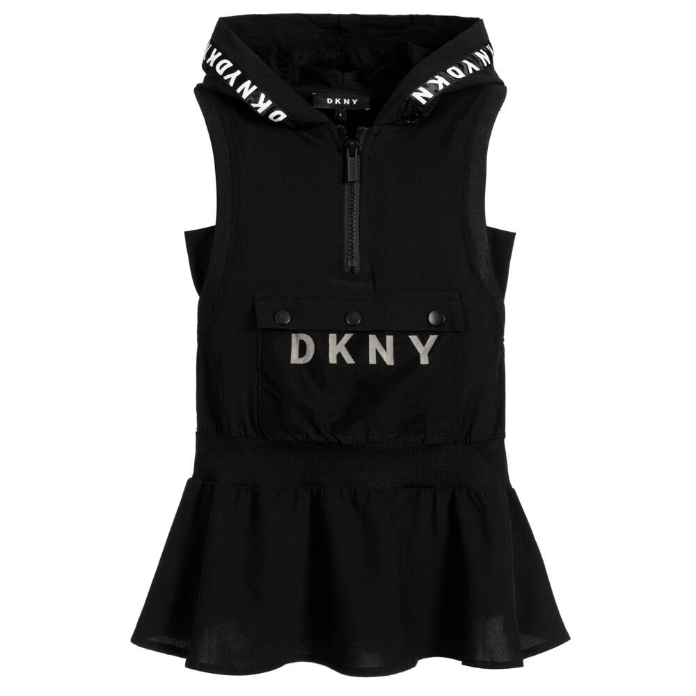 Girls sporty black dress with white logos, by DKNY. Made in soft, silky fabric, it has a hood, a mesh pocket and an elasticated dropped waist.