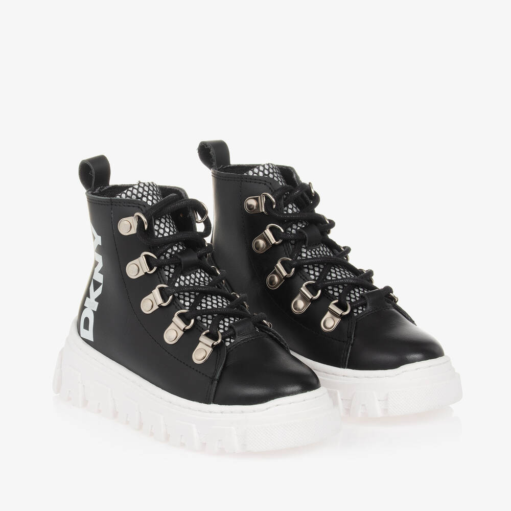 Stylish black lace-up boots for girls by American label DKNY, made from smooth leather. This cool design has a bold, white logo print on one side for instant designer appeal, with silver metal eyelets and a mesh tongue adding an edgy look. Comfortably lined in soft textile, they have a lightly padded insole and a chunky white rubber outer sole for good grip.