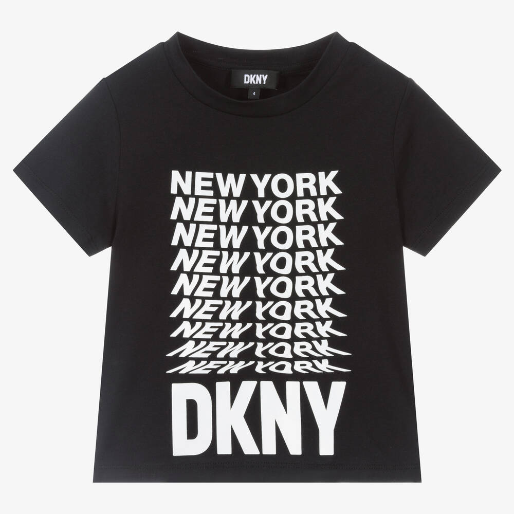 A black T-shirt for girls by DKNY, made in soft organic cotton jersey. For a modern streetstyle, this crew neck top is patterned with a wavy 'New York' logo print in white.