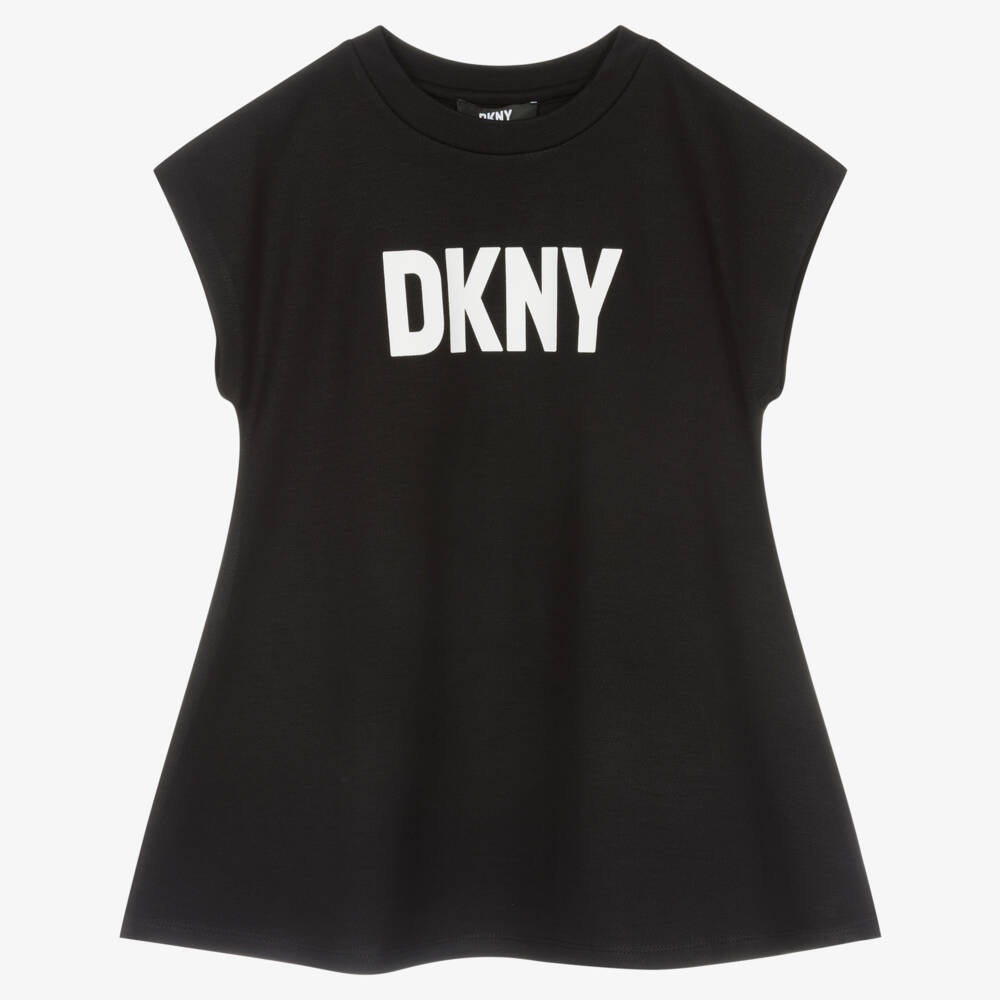 Black dress for girls by DKNY, made in mid-weight jersey twill. An easy-wear option, this cool dress is finished with a large white rubberised logo print on the front for an unmistakable designer touch.
