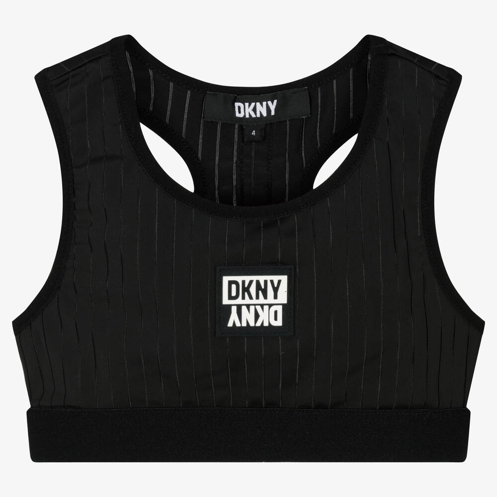 In black, this cropped sports top for girls is by DKNY. Silky smooth and stretchy, with elasticated trims, it is comfortable for activewear. There is a stand-out black and white rubberised logo on the front, with coordinating logo tape down the racer-style back.
