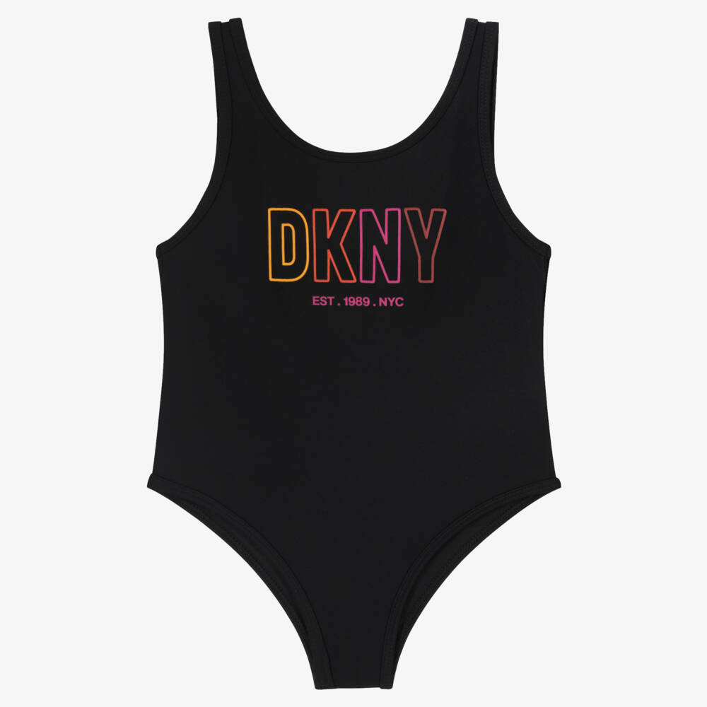 A black swimsuit for girls by DKNY, made in a smooth fabric with a breathable lining. This suit is characterised by a logo print on the chest, in orange, red and pink. It has an elegant scooped back for a contemporary modern style.