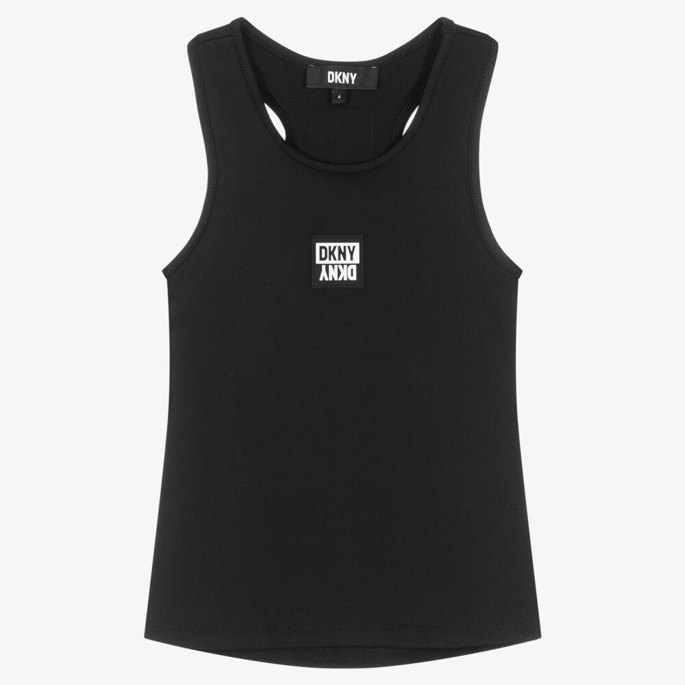 Girls black vest top by DKNY, made in silky soft and stretchy fabric. Great for sports and activities, it has a rounded neckline and an open racerback design for comfort. There is a rubberised logo patch on the chest and matching logo tape on the back for a truly original look.