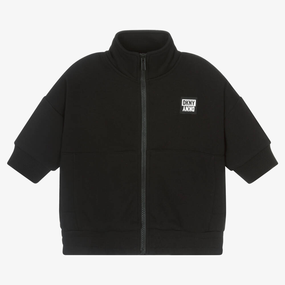 Sleek and stylish, this black zip-up top for girls is by DKNY. Made in soft cotton jersey with a looped underside, this casual short-sleeved top has pockets and comfortably ribbed trims. The brand's iconic rubberised logo is distinctively positioned on the chest.