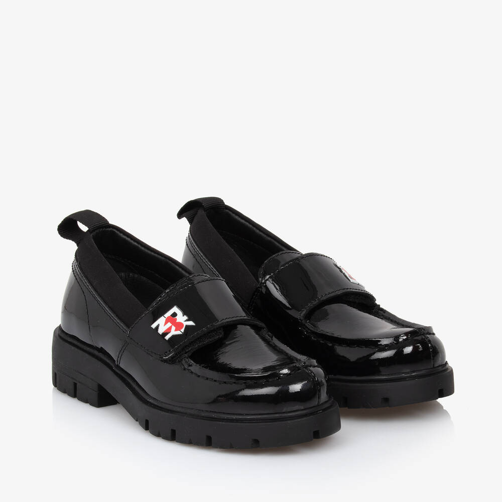 Black patent leather loafers for girls by DKNY, branded with The Heart of NY logo for iconic style. These glossy shoes have a velcro strap across the foot and a grosgrain pull tab on the back of the heel. They are lined with soft leather and finished with a chunky non-slip sole.