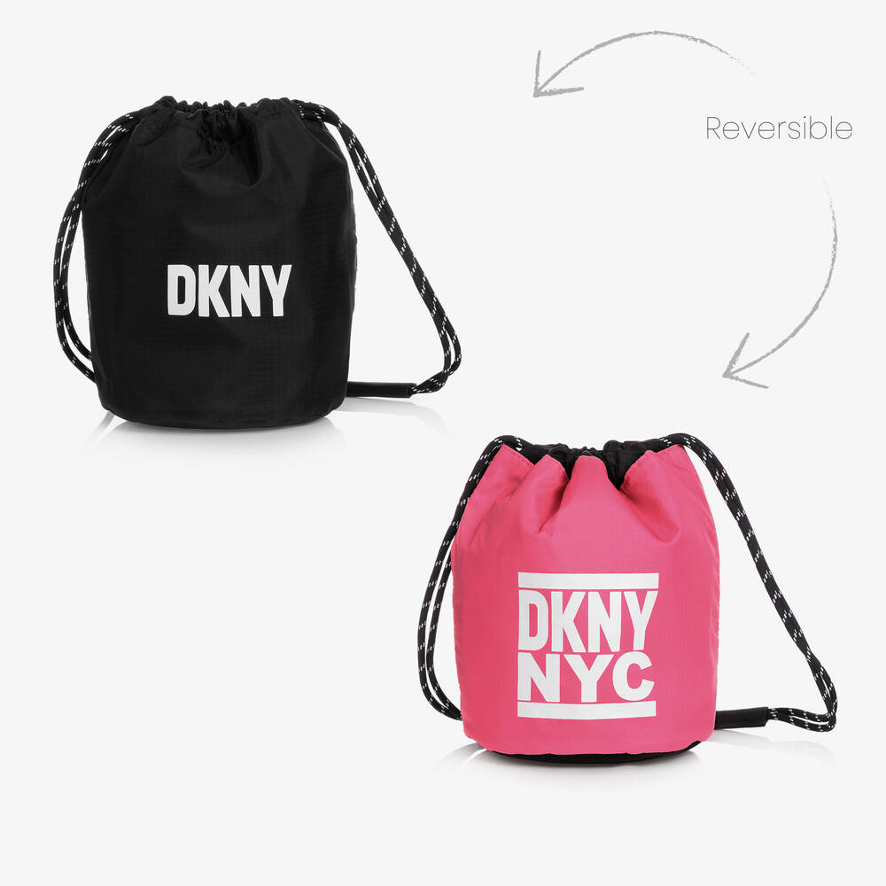 Reversible shoulder bag for girls by DKNY. Silky smooth, this fun accessory is black on one side and bright fuchsia pink on the other. Both sides have white logo prints. The shoulder strap is made from cord and can be pulled to secure the top of the bag.