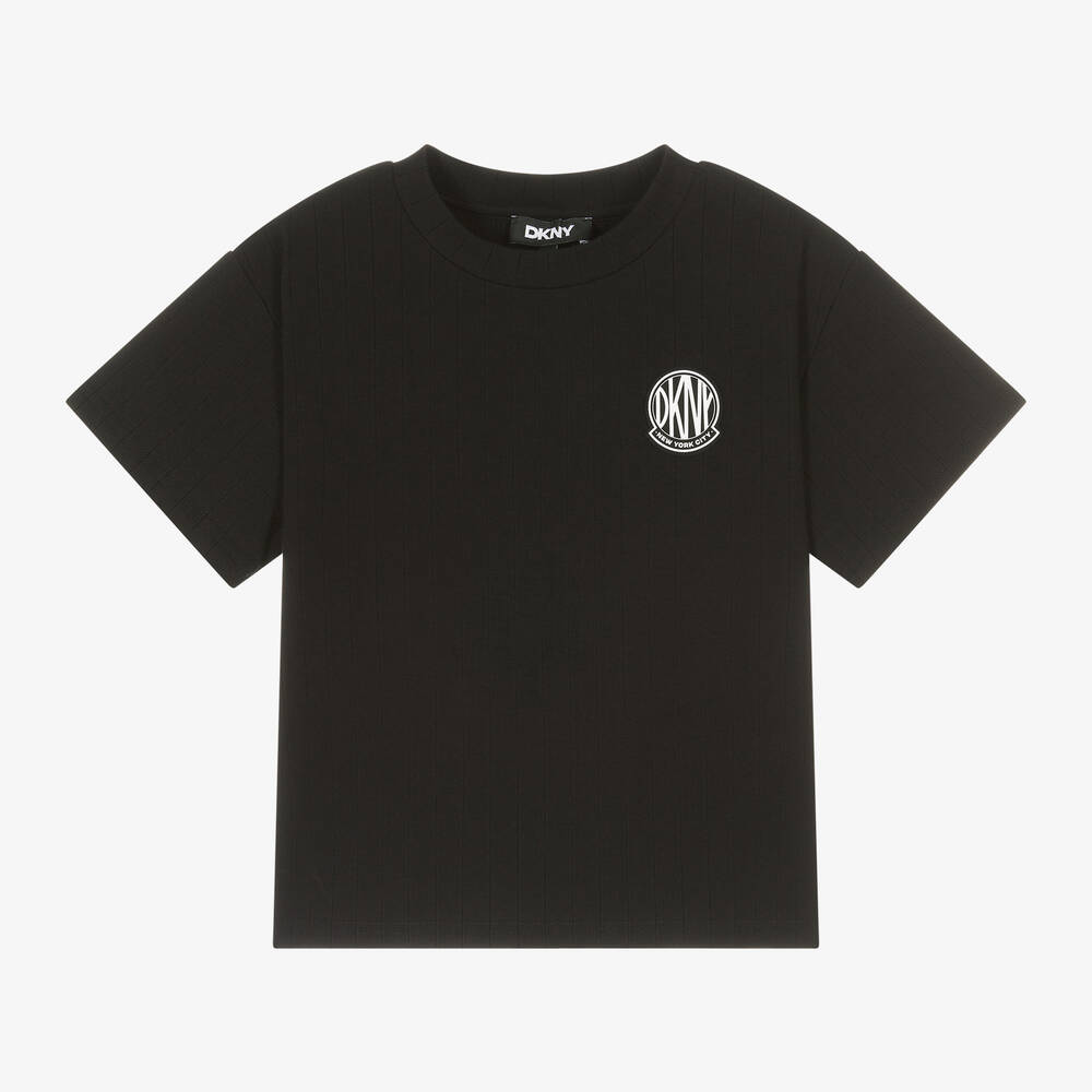 Black cotton T-shirt for girls by American brand DKNY, made in comfortable jersey. A T-shirt with a difference, it is self-striped and has a rubberised black and white logo for instant designer appeal.