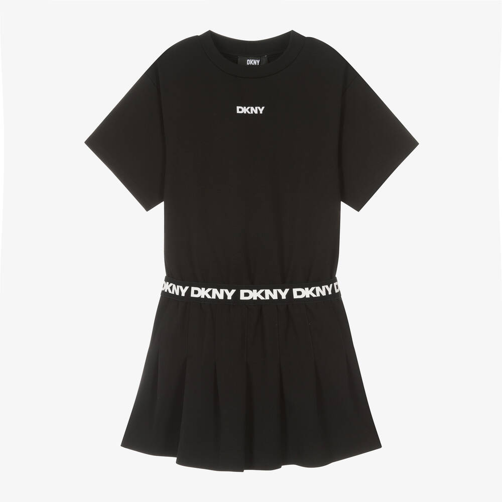 A black short-sleeved dress for girls by DKNY. The T-shirt-style bodice is made from soft Milano jersey and is printed with a bold white logo on the chest for a signature look. In a cool dropped-waist style, it has a pleated twill skirt with a repeat logo-detailed elasticated waistband for comfortable wear.