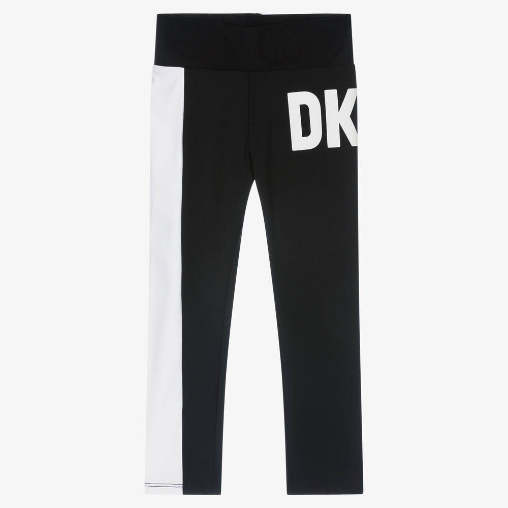 Black and white leggings for girls by DKNY, made from silky soft and stretchy fabric. They have a wrap-around white logo print on one leg and a wide white stripe down the other leg for a sporty look.