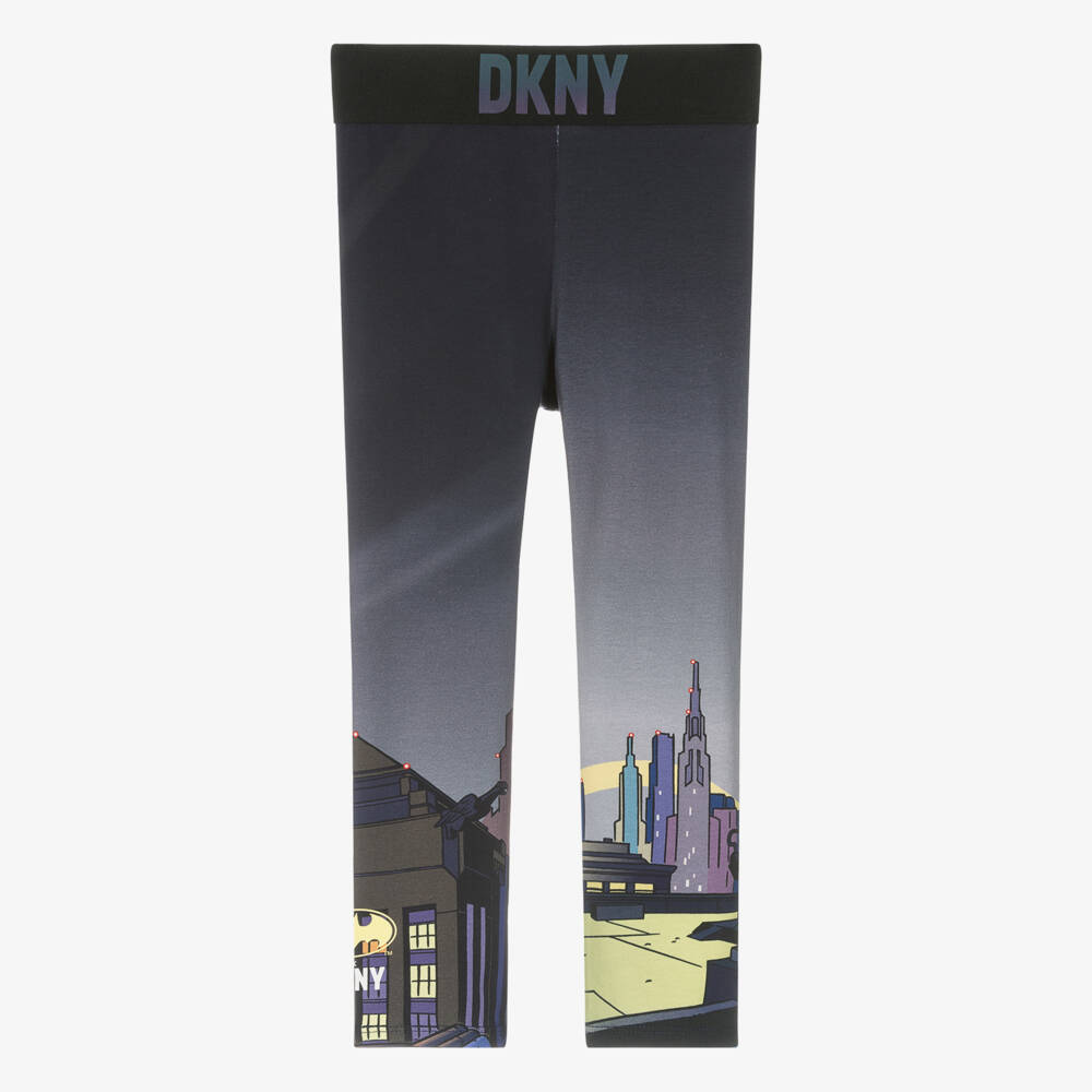 Cool blue leggings for DKNY, made from soft and stretchy cotton jersey. Inspired by the iconic superhero comic strip, they have a bright Batman cityscape design with a yellow Batman x DKNY logo printed on the ankle. The comfortable elasticated waistband is finished with a shiny iridescent motif.
