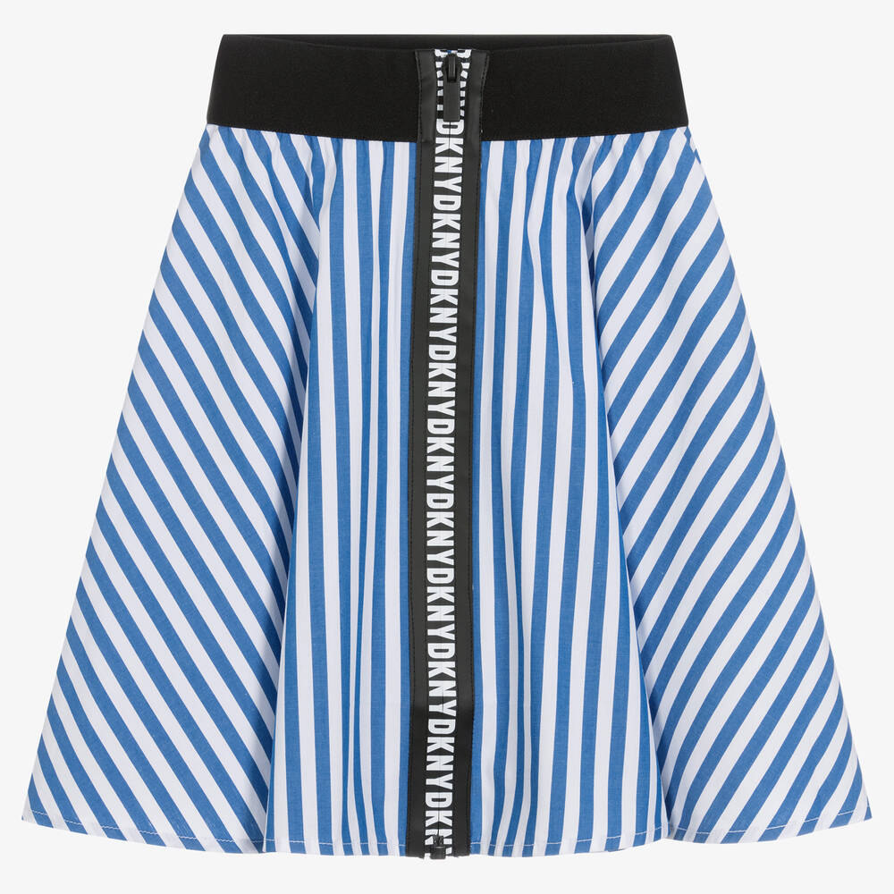 White and blue striped cotton skirt for girls by American brand DKNY, made in soft, lightweight poplin. This cool, laid-back design has a statement logo tape zip running down the front and a wide, black, elasticated waistband for a great fit.