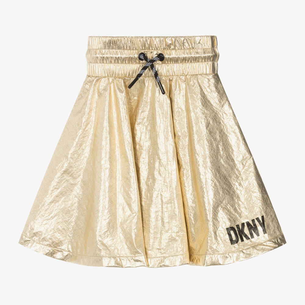 A standout, gold metallic skirt for girls by DKNY. Lightweight and shimmery, this eye-catching style is printed with a bold black logo near the hemline for a branded finish. The wide elasticated waistband has a black and white drawstring fastening for a comfortable fit.