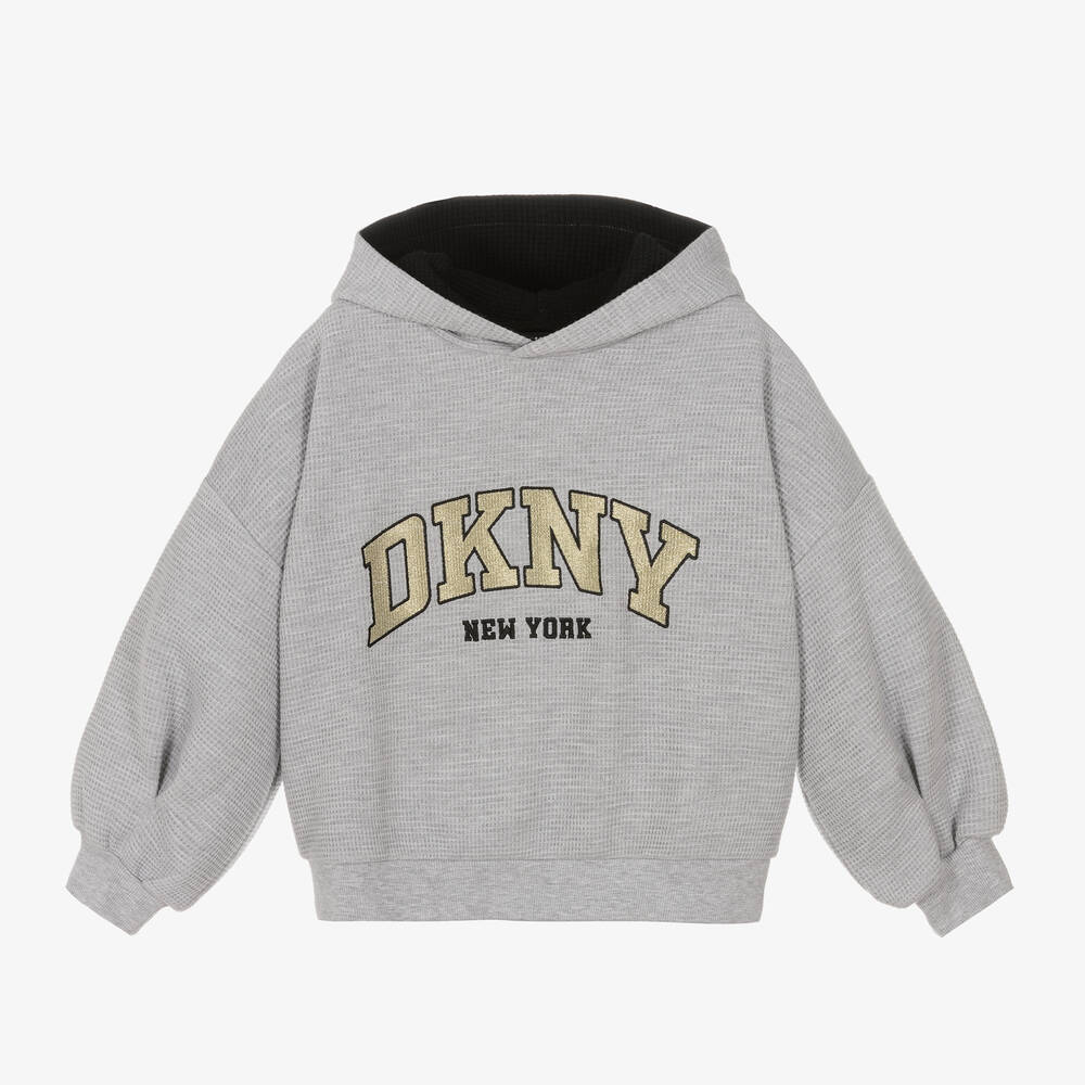 Inspired by the main collection, this grey hoodie for girls by DKNY is made from a soft waffle knit. It is embroidered with a black and metallic gold logo on the front and has a branded patch on the back for a signature finish. The dropped-shoulder long sleeves have pleated details near the cuffs and the hood has black lining for an added element of contrast.