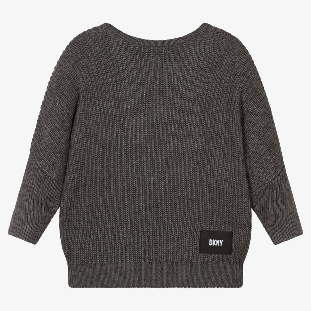 A dark grey sweater for girls by streetwear brand DKNY, knitted in a soft cotton and wool blend. Relaxed and comfortable to wear, it has a wide neckline and batwing sleeves. There is a black and white logo patch on the front, with an elasticated logo strap across the back for a modern finish.