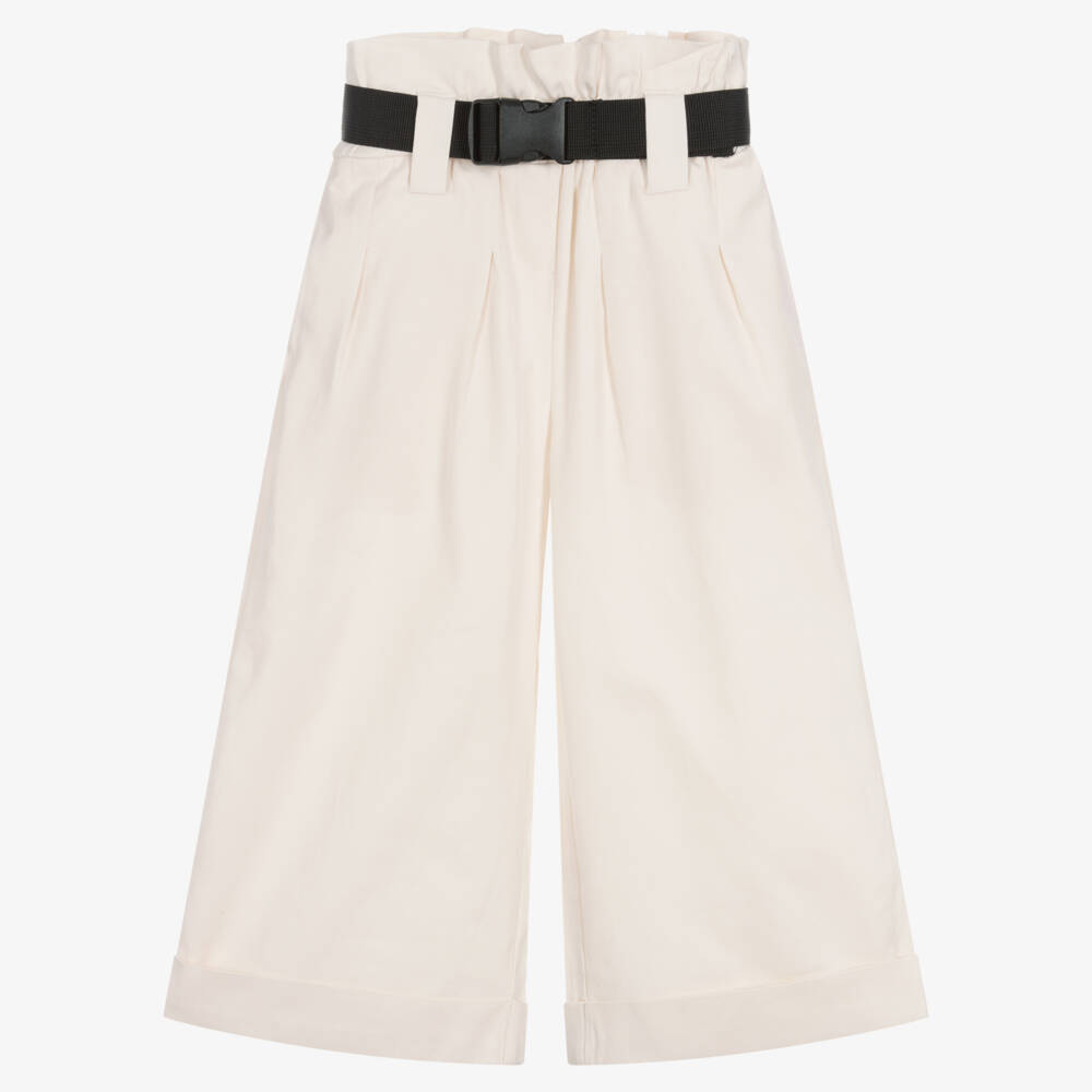 Stylish ivory trousers for girls by DKNY, made in soft cotton blend twill. In a cool, utility style, they have a super wide leg fit with tailored-style pleats on the front. They have a paper bag style waist for a relaxed fit, and come with a detachable black clip belt for an industrial twist. The designer's monochromatic mirrored logo badge is rubberised on the back for an instantly recognisable logo look.