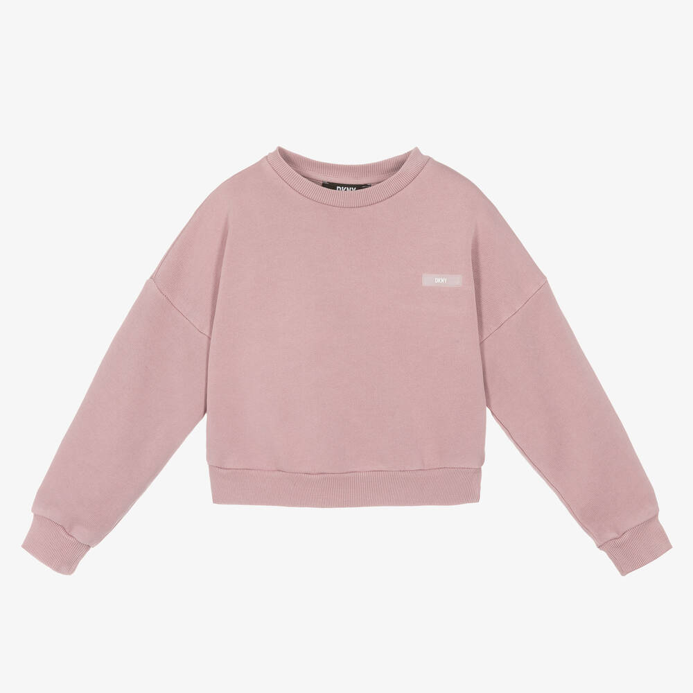 Lilac pink cotton sweatshirt for girls by American brand DKNY, with a white rubberised logo badge on the chest and a repeat purple logo panel across the shoulders and along the sleeves. Just right for relaxed, casual days, it is made in comfortable jersey with cosy ribbed trims.