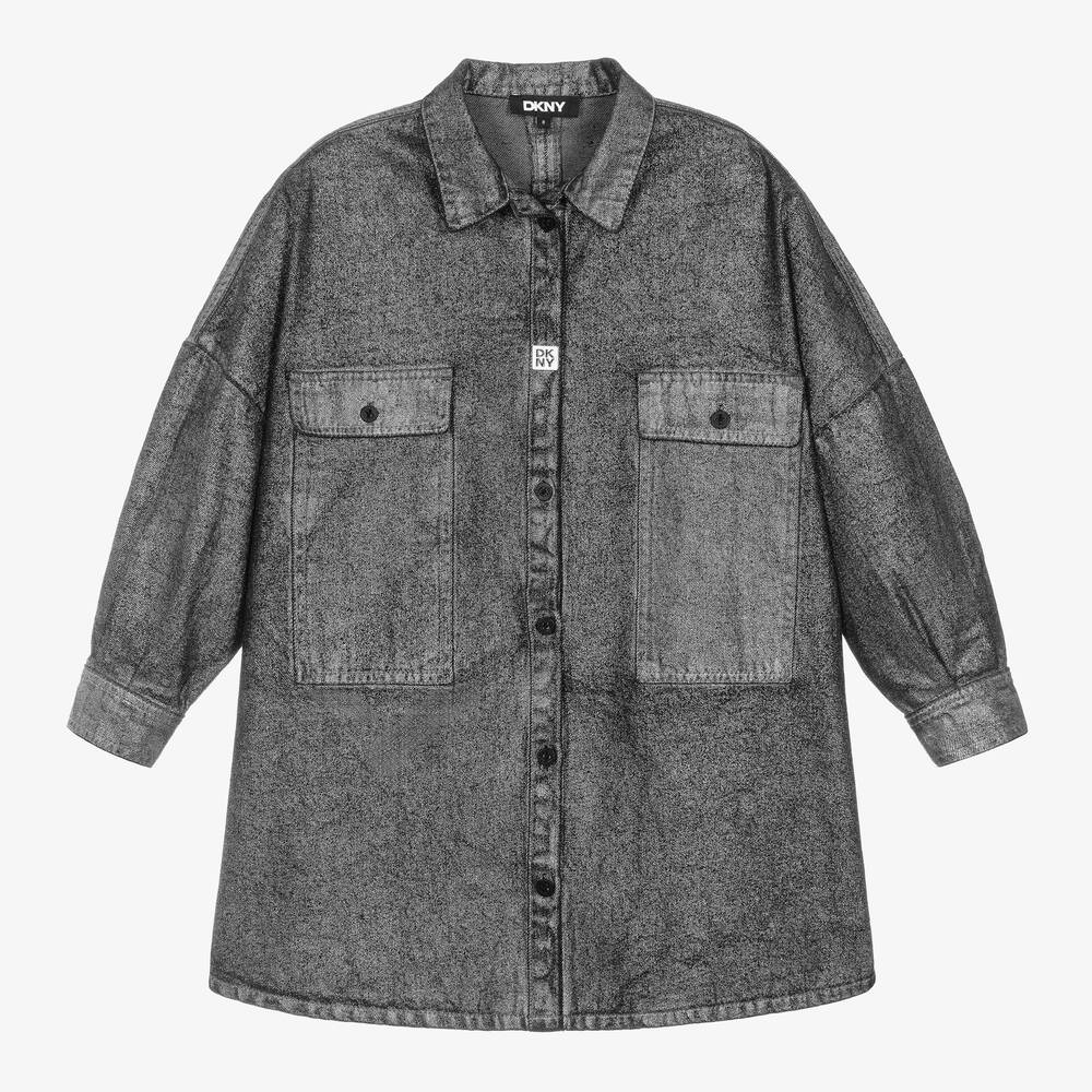 By New York based brand DKNY, this metallic silver denim dress for girls is stylish and contemporary. Designed with a distressed effect, it has an oversized fit, a relaxed shirt shape and a shiny silver logo badge on the chest. There are button fastenings on the front, each embossed with the label's logo for a subtle branded detail. Bold branding on the back of the neck completes the streetwear-inspired style.