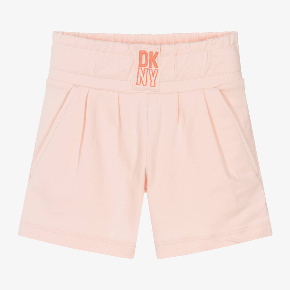 Casual pale pink cotton shorts for girls by DKNY, made in super soft brushed feel jersey. They have a vibrant coral orange logo embroidered on the wide elasticated waistband and printed branding on the back. The front has subtle pleated detailing and useful slanted pockets.