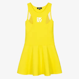 Purple dress for girls by DKNY, made in soft, mid-weight sweatshirt jersey. This casual dress has a contrast purple logo printed across the back and back of the sleeves for a bold designer statement. It has cosy ribbed trims, concealed side seam pockets and a white rubberised logo on the chest for a subtle designer finish.