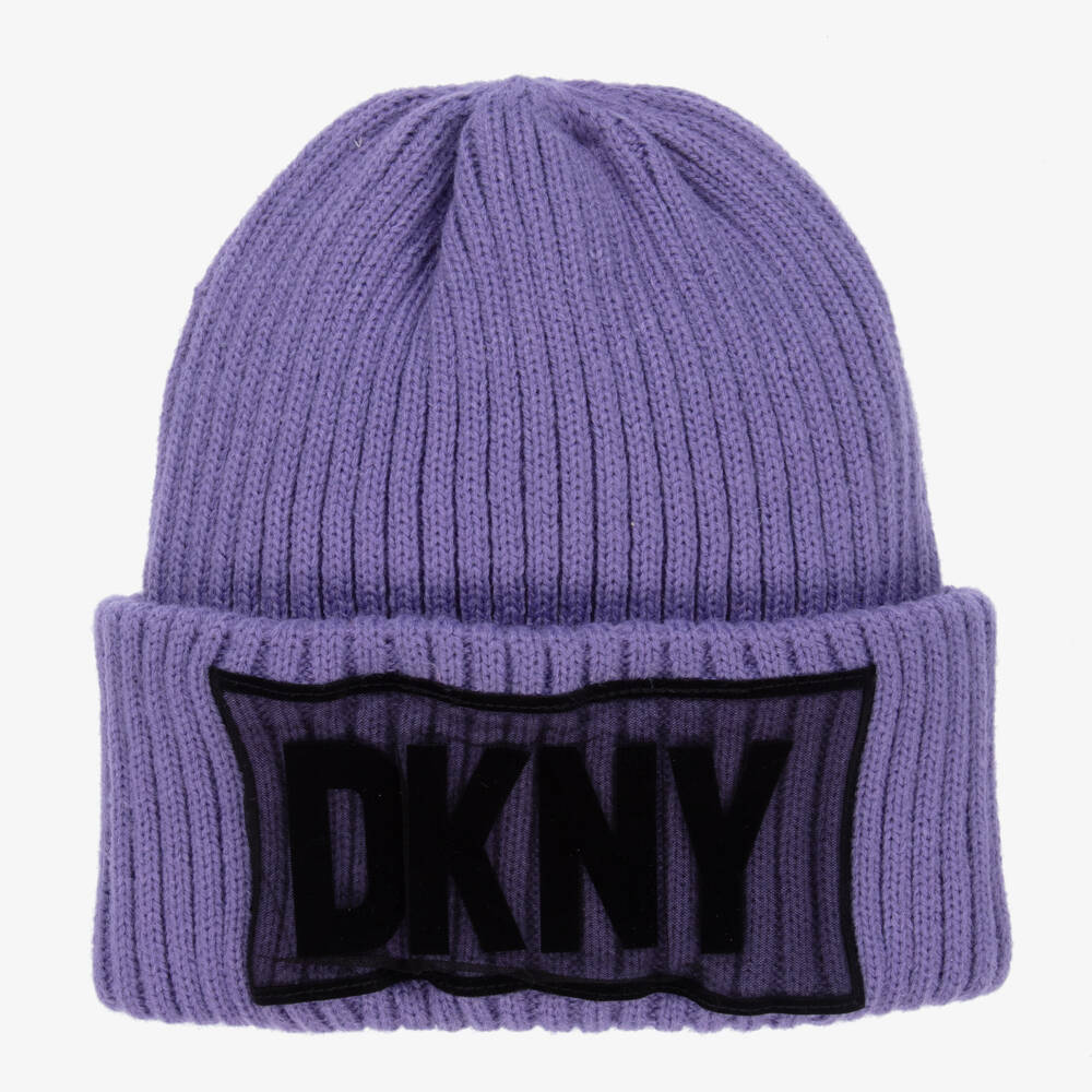 Purple beanie hat for girls by DKNY, knitted in soft acrylic. The turned-up brim is trimmed with a black mesh panel with a flocked black logo.
