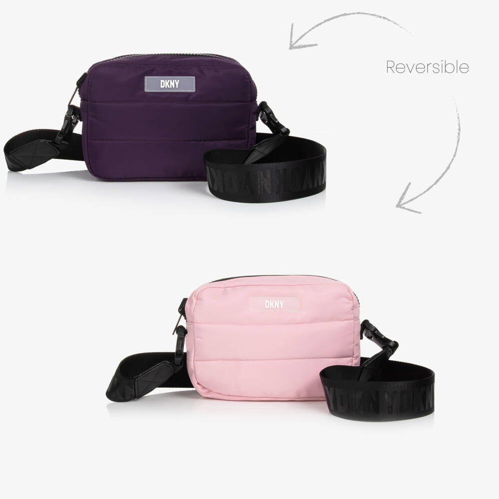 Lovely reversible shoulder bag for girls by DKNY. Silky smooth, this lightly padded bag is purple on one side and pink on the other, ideal for coordinating with different outfits. Both sides have rubberised logo patches for a signature designer finish. It fastens with a chunky branded zip and has a detachable black jacquard logo strap.