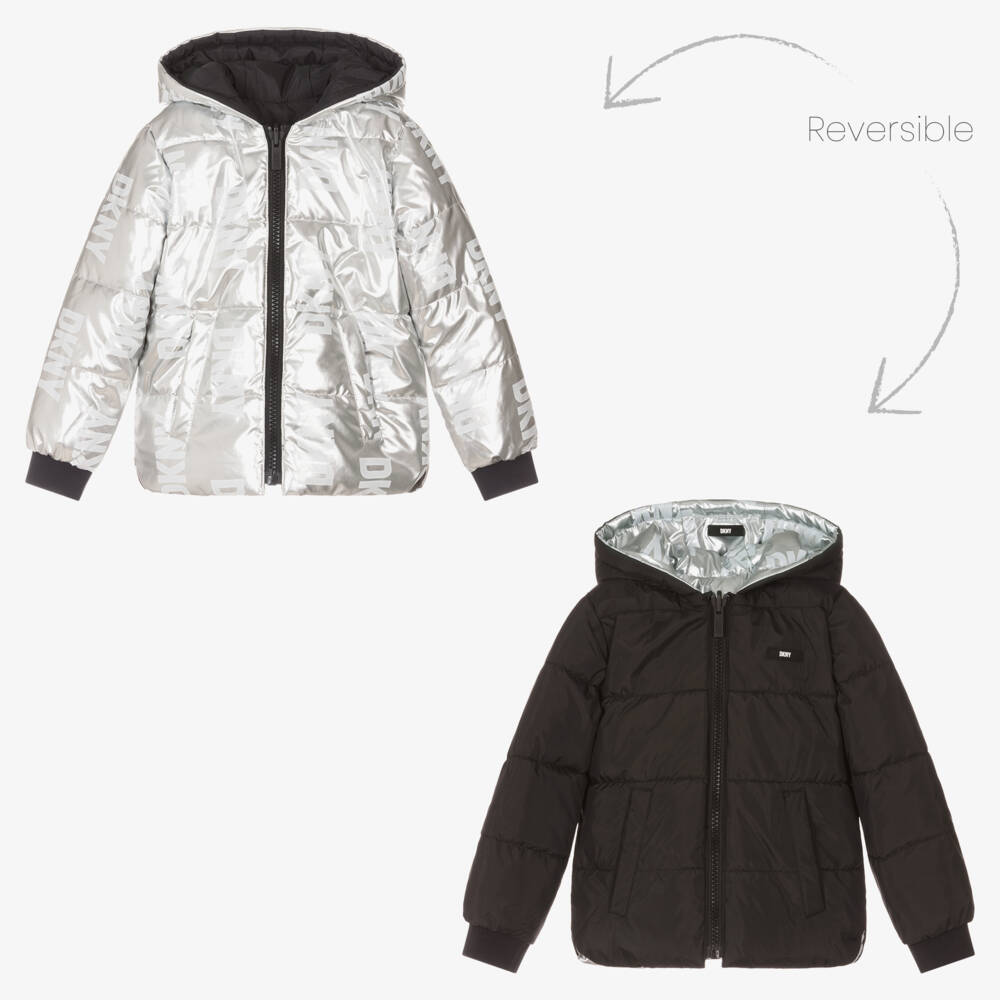 Silver and black hooded puffer jacket for girls by DKNY, made in a silky smooth fabric and lightly padded for warmth. In a cool reversible style, the metallic silver side is instantly eye-catching and has a white vertical logo design, with a rubberised logo on the hood for extra designer appeal. The reverse is black, with a soft borg fleece logo on the back, trimmed in white for a bold finish. With stretchy ribbed cuffs, this cosy coat has pockets on both sides and fastens with a branded zip.