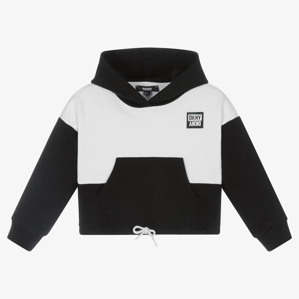 A vivid white and black hoodie for girls by DKNY, made in soft cotton jersey. Cool and easy-to-wear, the drawstring waist can be pulled in, giving definition to this boxy style. For an eye-catching finishing touch, the brand's iconic rubberised logo is featured on the chest.
