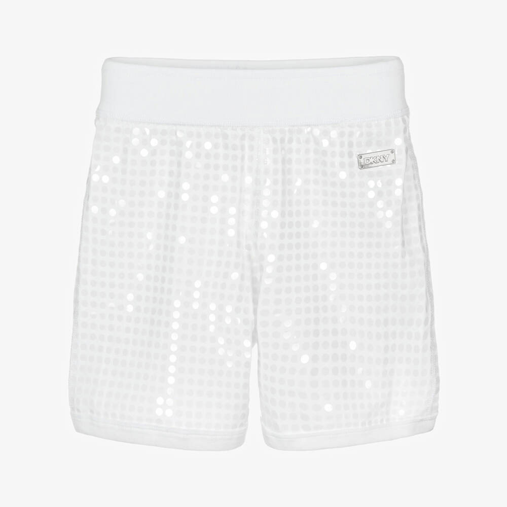 White sequin-effect shorts for girls by DKNY. Capturing the brand's urban chic style, they feature a dazzling sequin overlay, offering a playful shimmer. Made from soft cotton jersey with an elasticated waist, they ensure comfort and flexibility. Finished with a branded silver metal plate on the front, they will add a touch of sparkle to her day.
