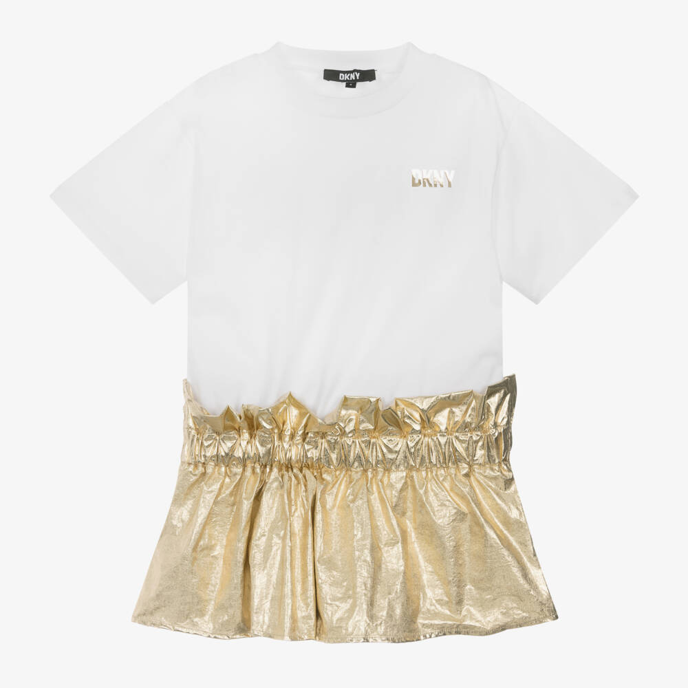 Bold and eye-catching, this white and gold dress for girls by DKNY is great for a casual party look. Made from soft cotton jersey, the short-sleeved bodice is printed with a shiny logo for a branded finish. Smooth and lightweight, the dropped waist ruffled skirt is elasticated at the top for a comfortable fit.