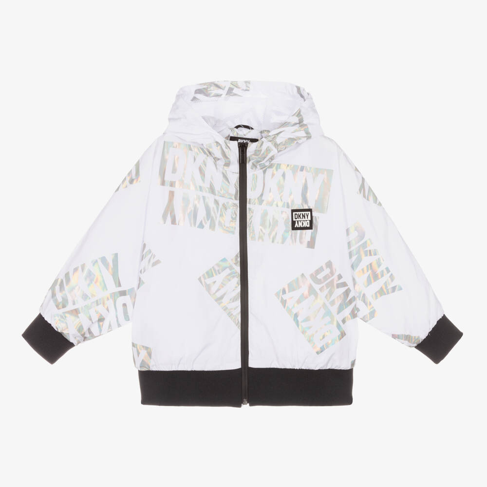 A white hooded windbreaker jacket for girls by DKNY. For a striking streetwear look, it has an iridescent silver logo design, with a black rubberised motif on the chest. Smooth and lightweight, the jacket has a sealed zip fastening and elasticated rib trims for added protection, and a breathable mesh lining for comfort.