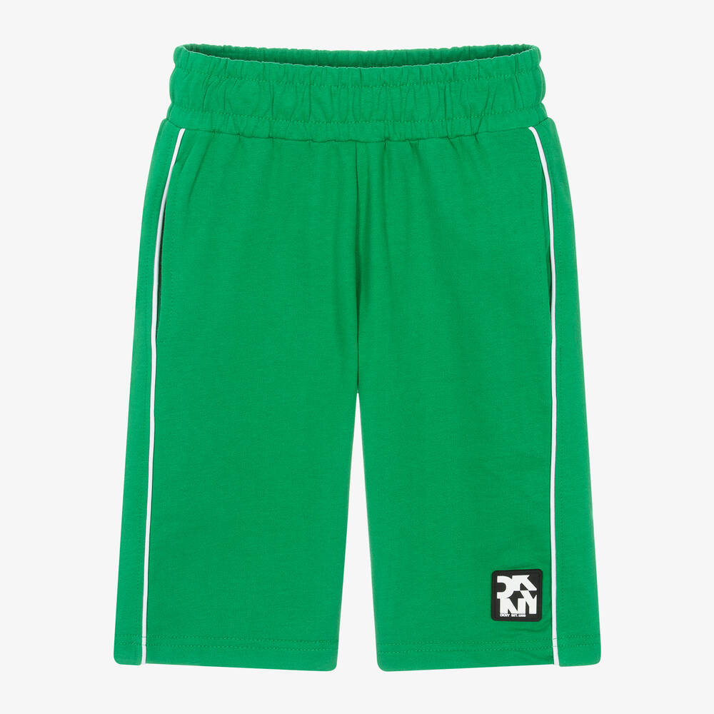Sporty green cotton shorts for boys and girls by DKNY, in a stylish longer length. Made in soft, mid-weight jersey with white piped trims, this casual style has concealed pockets and a comfortable elasticated waistband. A rubberised branded patch adds instant designer appeal.