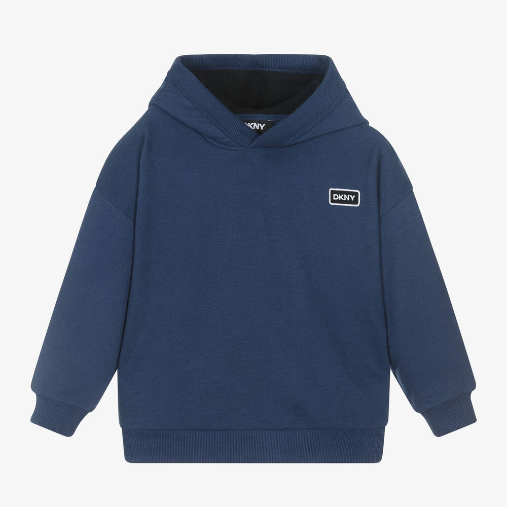 Cool navy blue hoodie for boys and girls by DKNY. Made in mid-weight cotton jersey with a super soft brushed feel and cosy ribbed trims, it is designed in a relaxed fit with dropped shoulders. The hood has a black waffle-textured jersey lining and a bold embroidered logo. Completing the look with a distinctive designer touch, there is an embroidered logo patch on the chest.