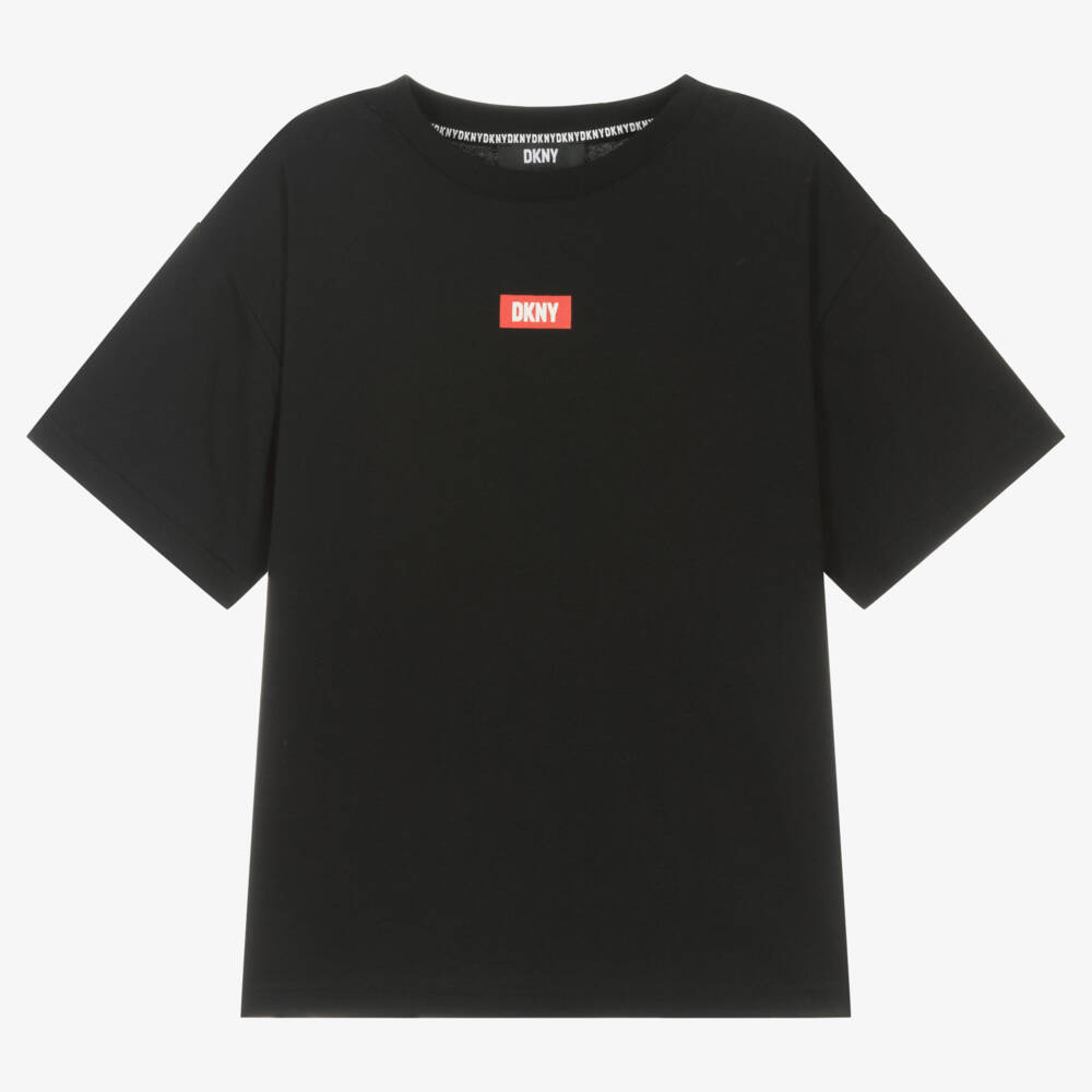 Black T-shirt for teen boys and girls by DKNY, with a red and white rubberised logo print on the chest and a large white logo on the lower back. In an oversized fit, this cotton jersey tee has a classic crew neck and dropped sleeves for a casual look.