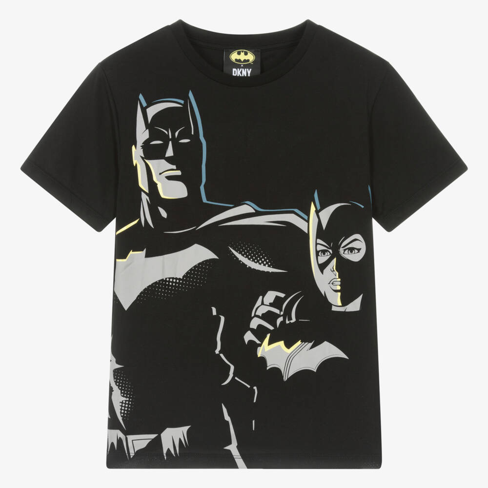Teen boys black cotton T-shirt by American brand DKNY, with a bold graphic Batman and Batgirl print. A cool style for superhero enthusiasts, this crew neck top has an iridescent Batman x DKNY logo on the back.