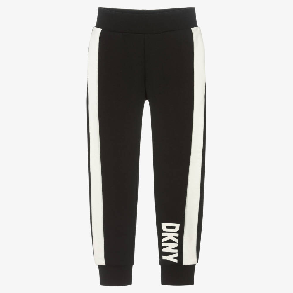 Teen boys black cotton joggers by American brand DKNY, with a white logo print on one leg. A contemporary take on a staple piece, these bottoms have bold white coated trims on the sides of the legs.