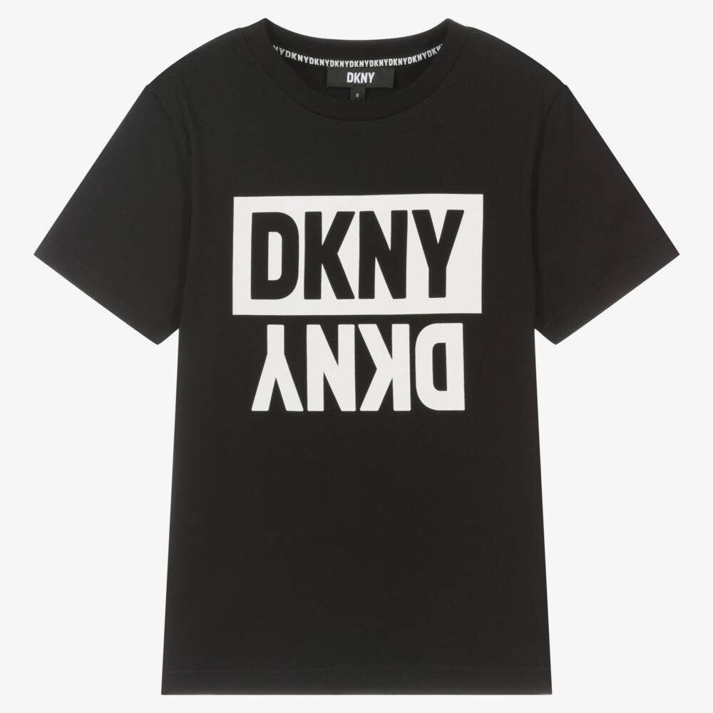 A casual black T-shirt for teen boys by DKNY, with a white flip and reflect logo print on the front. Made in soft cotton jersey, this regular fit tee has short sleeves and a classic crew neck for added comfort.
