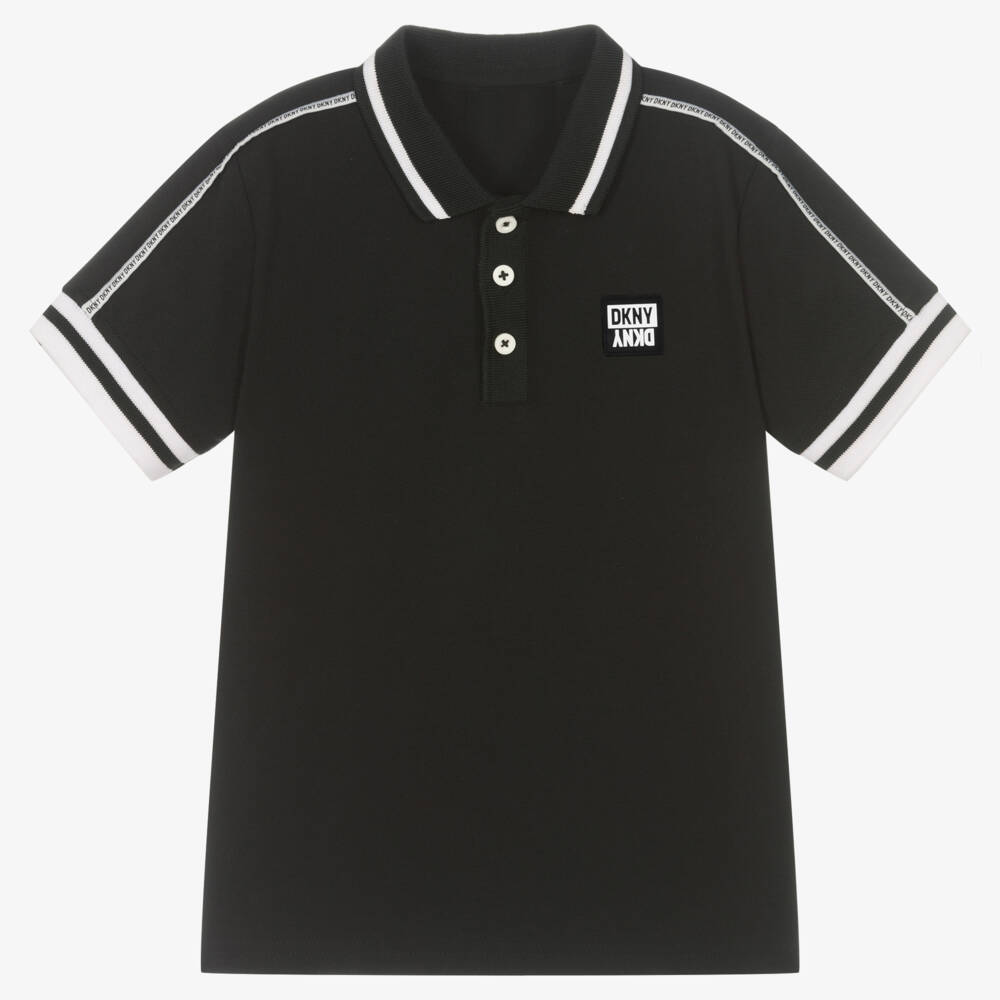 From iconic American brand DKNY, this teen boys black polo shirt is made from soft cotton piqué. It has a black and white rubberised box logo on the front along with white logo trims on the shoulders. Styled like a typical polo shirt, it has a button-up collar and ribbed white and black trims.