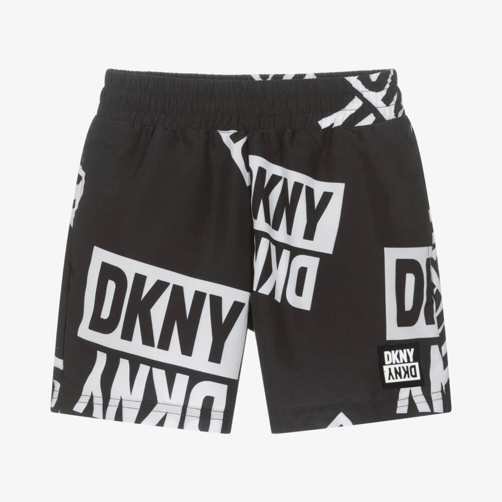 Black swim shorts for teen boys by American brand DKNY, made in silky and lightweight fabric. Unmistakably DKNY, they have an all-over white logo print and a mirrored logo patch on the front. They are finished with side pockets and a mesh lining for comfort and drainage.