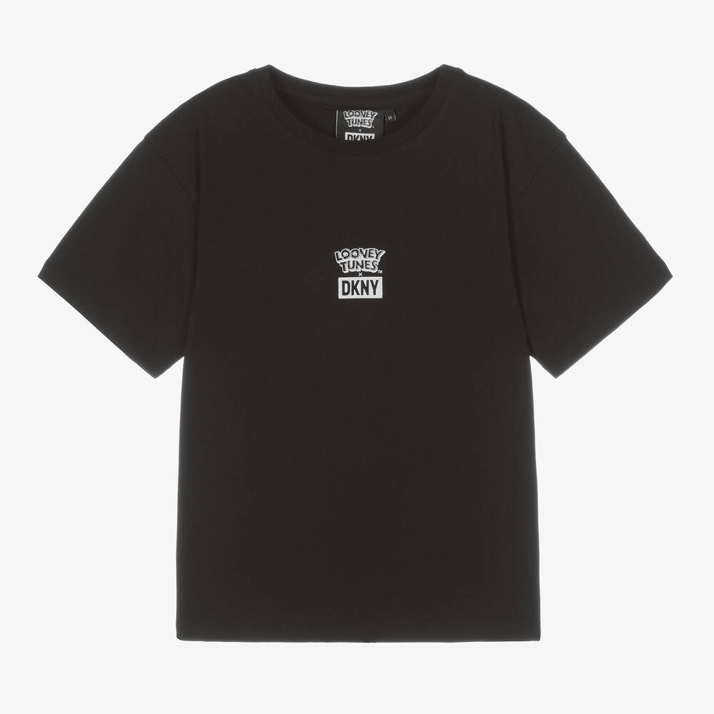 Cool black and white cotton T-shirt for teen boys by DKNY. This cartoon-inspired tee has an oversized Daffy Duck character print with the iconic phrase 'That's All Folks!' on the back of the neck, with Looney Tunes x DKNY stamped on the front to mark the collaboration. Fun and comfortable, it is made in organic cotton jersey.