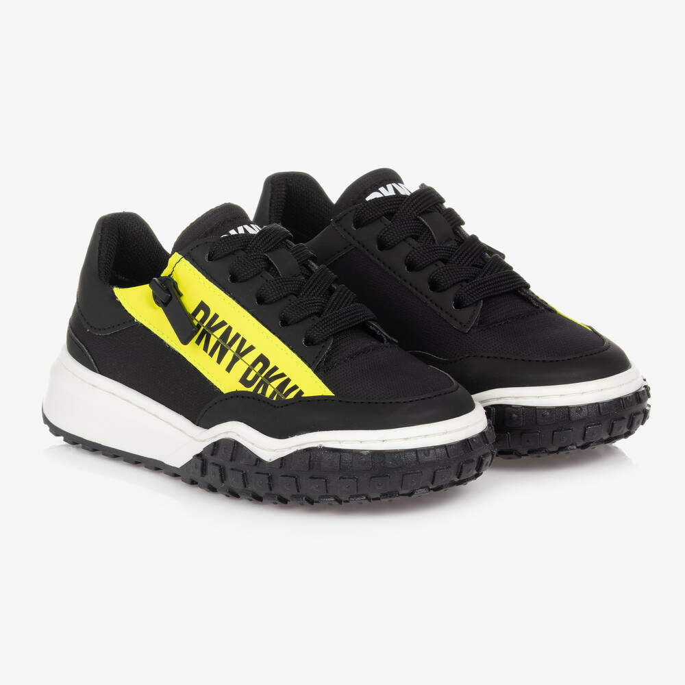 Black logo-inspired faux leather trainers for teen boys by DKNY, offering a contemporary sporty style. A bold white logo is printed on the tongue, with a neon yellow logo taped zip fastening for a cool yet functional look. Securing neatly with laces, the white midsole is super chunky, with deep non-slip ridges.