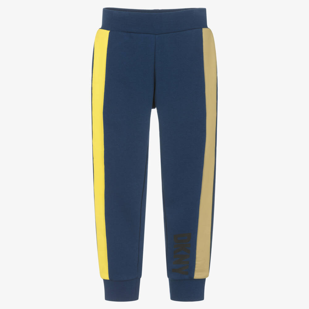 Teen boys blue cotton joggers by American brand DKNY, with a black logo print on one leg. A contemporary take on a staple piece, these bottoms have bold yellow and khaki green coated trims on the sides of the legs.