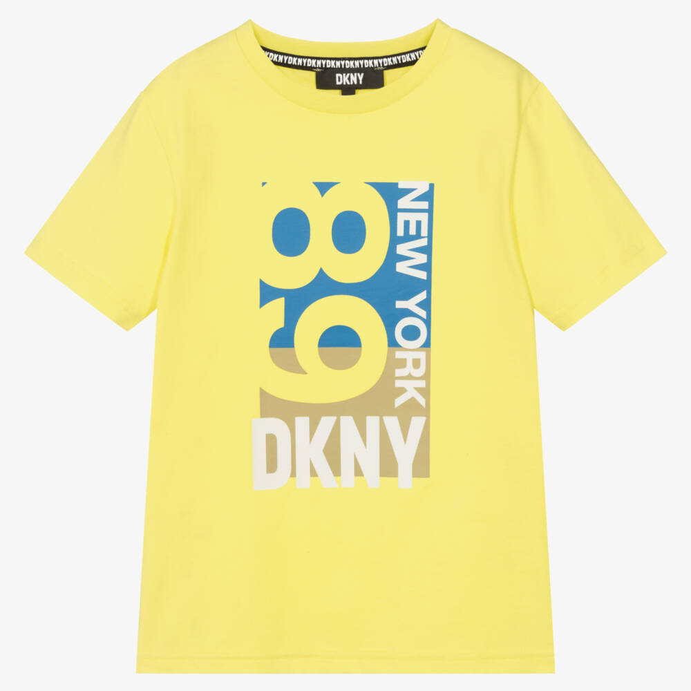 Bright lime green cotton T-shirt for teen boys from DKNY, with a blue and pale khaki green New York inspired logo print on the front.